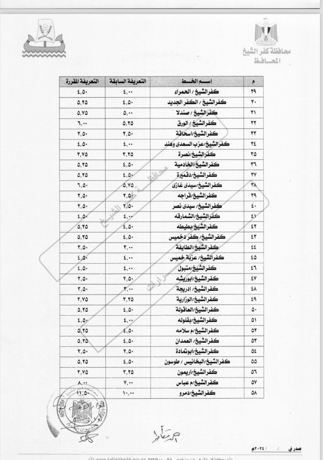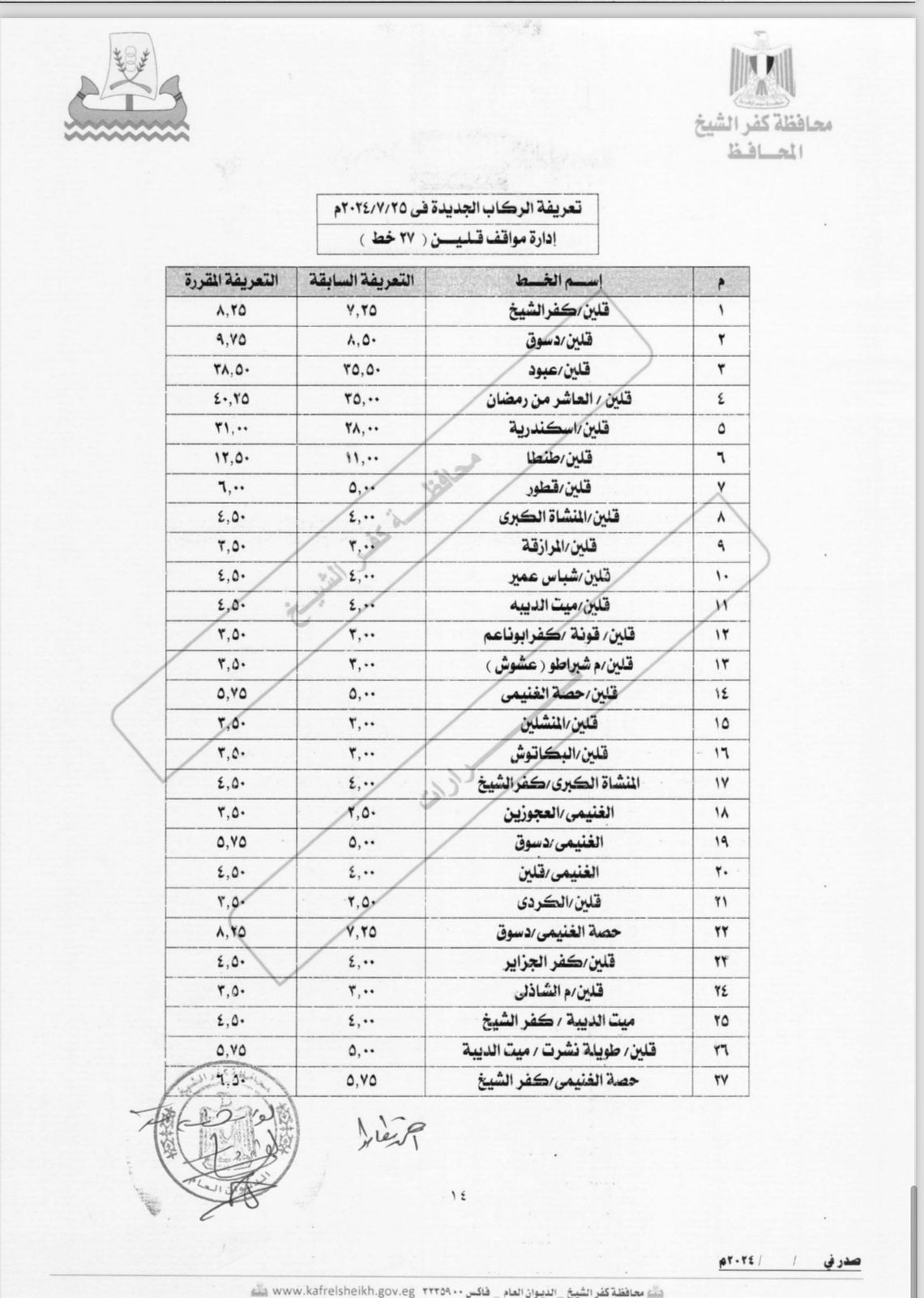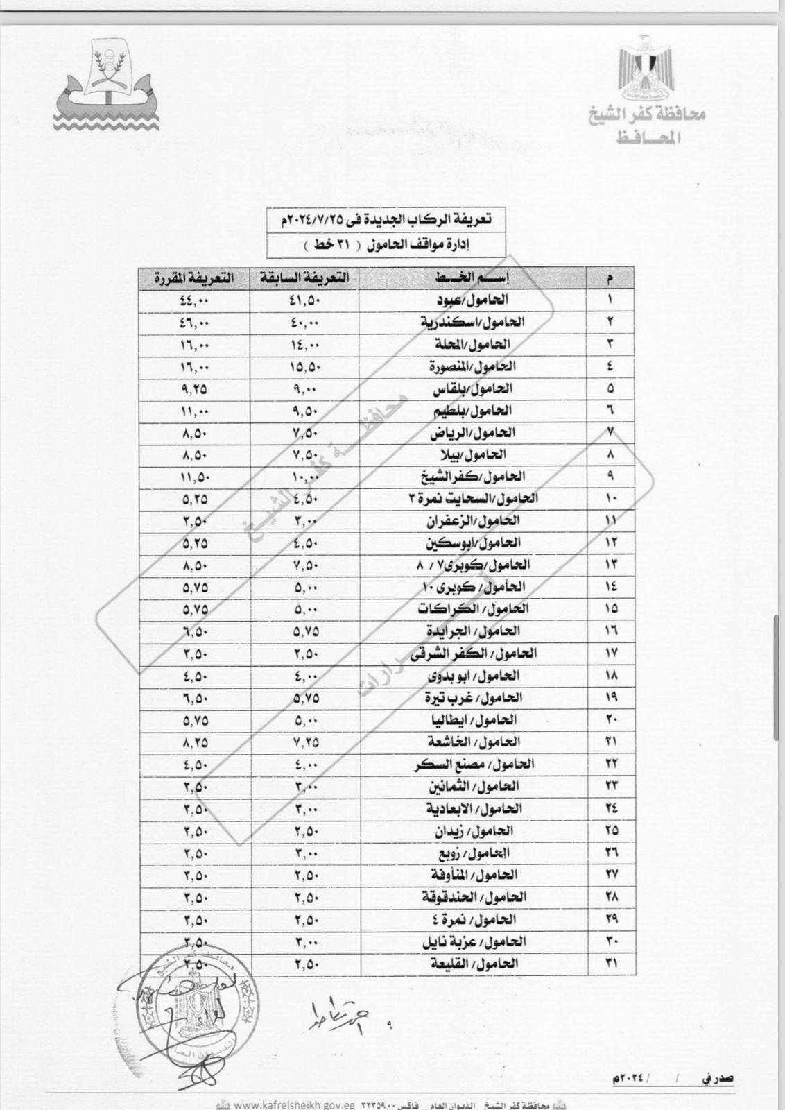 صدق اللواء دكتور علاء عبد المعطي محافظ كفر الشيخ علي التعريفة الجديدة لنقل الركاب عقب قرار لجنة التسعير التلقائي للمنتجات البترولية المعنية بوزارة البترول بتحريك أسعار المنتجات البترولية اعتباراً من اليوم الخميس الموافق 25/7/2024… مشددًا بعدم مخالفة التعريفة المقررة وخطوط السير أو إستغلال المواطنين.. وتكثيف الرقابة علي المواقف وسيارات الأجرة .. مناشداً المواطنين بالتمسك بحقهم في الابلاغ عن أي مخالفات علي الخط الساخن 114 والخط الأرضي رقم 0473220792 … مع إنعقاد دائم ومتابعة علي مدار اليوم من خلال غرفة العمليات وإدارة الأزمات ومركز سيطرة الشبكة الوطنية للطوارئ والسلامة العامة.